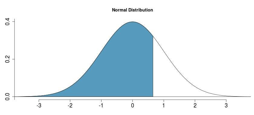 We get a value of 0.7454 so it means that 74.54% of the students scored below than Hasan i.e p(Z<0.66)=0.7454. It also implies that 1–0.7454=0.2546 =25.46% of the students scored greater than Hasan.